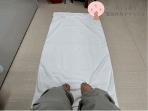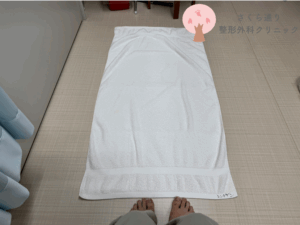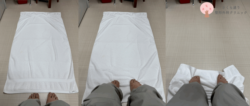 - 椅子に座り、かかとをタオルの“手前端”に置く